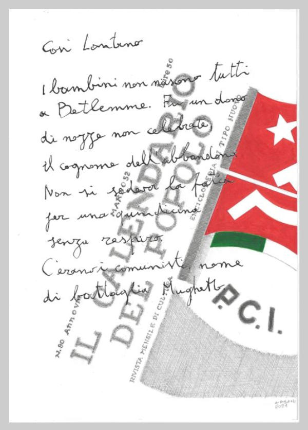 Renzo Ferrari. Cadro (CH), 1939.Pittorevive a Cadro (CH). Un fantasma si aggira in Europa,collage e acquerello su carta,29,5X21cm, 2021 Renzo Ferrari, Un fantasma si aggira in Europa, collage e acquerello su carta, 29,5X21cm, 2021 Nicola Salvatore. Casalbore (AV), 1951.Pittore e docentevive a Como. PCI,matita su carta,15x10cm, 2021 Nicola Salvatore, PCI, matita su carta,15x10cm, 2021 Carmine Sabbatella. Polla (SA), 1982.Artistavive a Milano. Il postino rosso di Tuni, tecnica mista su carta,30x20cm, 2021 Carmine Sabbatella, Il postino rosso di Tuni, tecnica mista su carta,30x20cm, 2021 Gianni Cella. Pavia, 1953.Artista e docentevive a Milano. PCI,2021 Gianni Cella, PCI, 2021 Achille Guzzardella. Milano, 1955.Scultorevive a Milano. Ricordo,rilievo in creta,2021 Achille Guzzardella, Ricordo,rilievo in creta,2021 Massimo Bandi. Cassolnovo(PV),1945.Pittorevive a Milano. Face and soul (la scelta),olio su tavola,40x30cm, 1978 Massimo Bandi, Face and soul (la scelta), olio su tavola,40x30cm, 1978 Giuseppe Denti. Paullo, 1939.Pittore,fotografo e graficovive a Milano. PCI 1921-2021,montaggio e tecnica mista,2021 Giuseppe Denti, PCI 1921-2021, montaggio e tecnica mista, 2021 Agostino Pisani. Savona, 1937.Scultorevive a Solcio di Lesa (NO). Così lontano,grafite e acrilico su carta,21x30cm, 2021 Agostino Pisani, Così lontano, grafite e acrilico su carta,21x30cm, 2021 Nader Khaleghpour. Langrud (Iran), 1947.Pittore, scultore e incisorevive a Padova. Viaggio,matite, chine e acquarelli su carta,70x59cm, 2021 Nader Khaleghpour ,Viaggio, matite chine e acquarelli su carta,70x59cm, 2021 Dario Zaffaroni. S.Vittore Olona (MI), 1943.Pittore, designer e art directorvive a Milano. N-50-24-18-Polimodularità monocroma,Carta fluorescentesu faesite, 50x50cm, 2018 Dario Zaffaroni, N-50-24-18- Polimodularità monocroma, carta fluorescente su faesite,50x50cm, 2018 Giovanni Mattio Cuneo, 1949.Pittore e docentevive a Milano. Separare il cielo,tecnica mista,50x38cm, 2021 Giovanni Mattio, Separare il cielo, tecnica mista,50x38cm, 2000 Lucia Rosano. Desio (MI), 1976.Pittricevive a Besana Brianza (MB). Non c'è un inizio non c'è una fine,tempera su carta (particolare),110x47cm, 2021 Lucia Rosano, Non c'è un inizio non c'è una fine,tempera su carta (particolare), 110x47cm, 2021 Marco Pellizzola. Cento (Fe), 1953.Pittore e docentevive a Milano. Il partito tra le stelle, acrilico e pastelli su tela, 60x30 cm, 2021 Marco Pellizzola, Il partito tra le stelle, acrilico e pastelli su tela, 60x30 cm, 2021 Maria Jannelli. Milano, 1951.Pittrice e docente vive a Milano. Maria Lisa Cinciari Rodano 100 «Marisa»,tecnica mista su tela,40x30cm, 2021 Maria jannelli, Maria Lisa Cinciari Rodano detta «Marisa», tecnica mista su tela, 40x30cm, 2021 Geremia Renzi. Monteromano(VT), 1955.Scultorevive a Besana Brianza (MB). Up,titanio e resina,100x100x50cm, 2020 Geremia Renzi, Up, titanio e resina,100x100x50cm, 2020 Mansoor Farahpoor. Iran, 1949.Scultore, pittore e calligrafovive a Roma dal 1975. L’opera fa parte di una serie di lavori realizzati in digitale sul tema dell’emigrazione, che partono da una poesia di tre versi del grande poeta persiano del tredicesimo secolo, Sa'dì. I colori sono i sette colori dell'arcobaleno, e in ogni opera ci sono due colori complementari. In questa immagine, il rettangolo in diagonale, Aylan, (in rosso) contiene i tre versi scritti in stile calligrafico Nasta’fligh. Lo scritto in verde, che sovrasta il rettangolo rosso, è il primo verso della poesia ed è in stile Shekasté. In basso a destra, i tre versi in Nasta’fligh sono in rosso con la traduzione in inglese. Infine a destra la mia firma in Tughra, e a sinistra il mio nome.I versi: «I figli di Adamo sono membra di un sol corpo, poiché creati della stessa sostanza;quando una delle membra viene afflitta dalla sorte ne soffriranno anche le altre membra: tu che non ti curi delle pene altrui, non sei degno d’esser chiamato uomo.» Mansoor Farahpoor,  "Aylan",  opera in digitale, 2020 Luca Ghirardosi. Bergamo, 1960.Scenografo e docentevive e lavora a Milano. Tessere,collage su carta,64x48cm, 2021 Luca Ghirardosi, Tessere,collage su carta,64x48cm, 2021 Angela Occhipinti, Il filo rosso, tecnica mista su carta e tavola, 50x24, 2021 Angela Occhipinti, Il filo rosso, 50x24 cm, 2021, tecnica mista su carta applicata su tavola CosimoDi Leo Ricatto. Catania, 1950.Pittorevive in Olanda. Alla maniera del movimento studentesco di Brera anni 70,tecnica mista su carta,38x28cm, 2021 Cosimo Di Leo Ricatto, Alla maniera del movimento studentesco di Brera anni 70, tecnica mista su carta,38x28cm, 2021 Franca Carugati. Saronno, 1951.Pittrice e docentevive a Milano. Cento,tecnica mista su carta,33x24cm, 2021 Franca Carugati, Cento,tecnica mista su carta,33x24cm, 2021 Paolo Baratella. Bologna, 1935.Pittore,attualmente vive a Lucca. Che fare?tecnica mista su tela,200x300cm, 2018 Paolo Baratella, Che fare?, tecnica mista su tela, 200x300cm, 2018 Pietro Coletta. Bari, 1948.Scultorevive a Milano. Segni visibili nel vuoto,tecnica mista su carta,42x30cm, 2019 Pietro Coletta, Segni visibili nel vuoto, tecnica mista su carta, 42x30cm, 2019 Renato Galbusera,Il tempo e la Storia, xilografia a colori,50x50cm, 2021